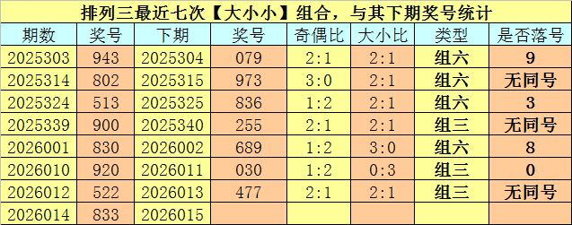 开奖转头:成列三第2026014期开奖号码为:833。奖号类型为:组三,大小类型为:大小小,奇偶类型为:偶奇奇,无重号。 大小分析:成列三上期开出号码833,大小类型为【大小小】,最近七次开出大小类型大小小的奖号永诀为:943、802、513、900、830、920、522,其下期永诀开出号码:079、973、836、255、689、030、477。其中号码大小比为13:8,小 号走势较冷,近期驻扎小 号逐渐回补,本期要点眷注小 号,参考大小比1:2。 奇偶分析:成列三上期奖号为833,其奇偶